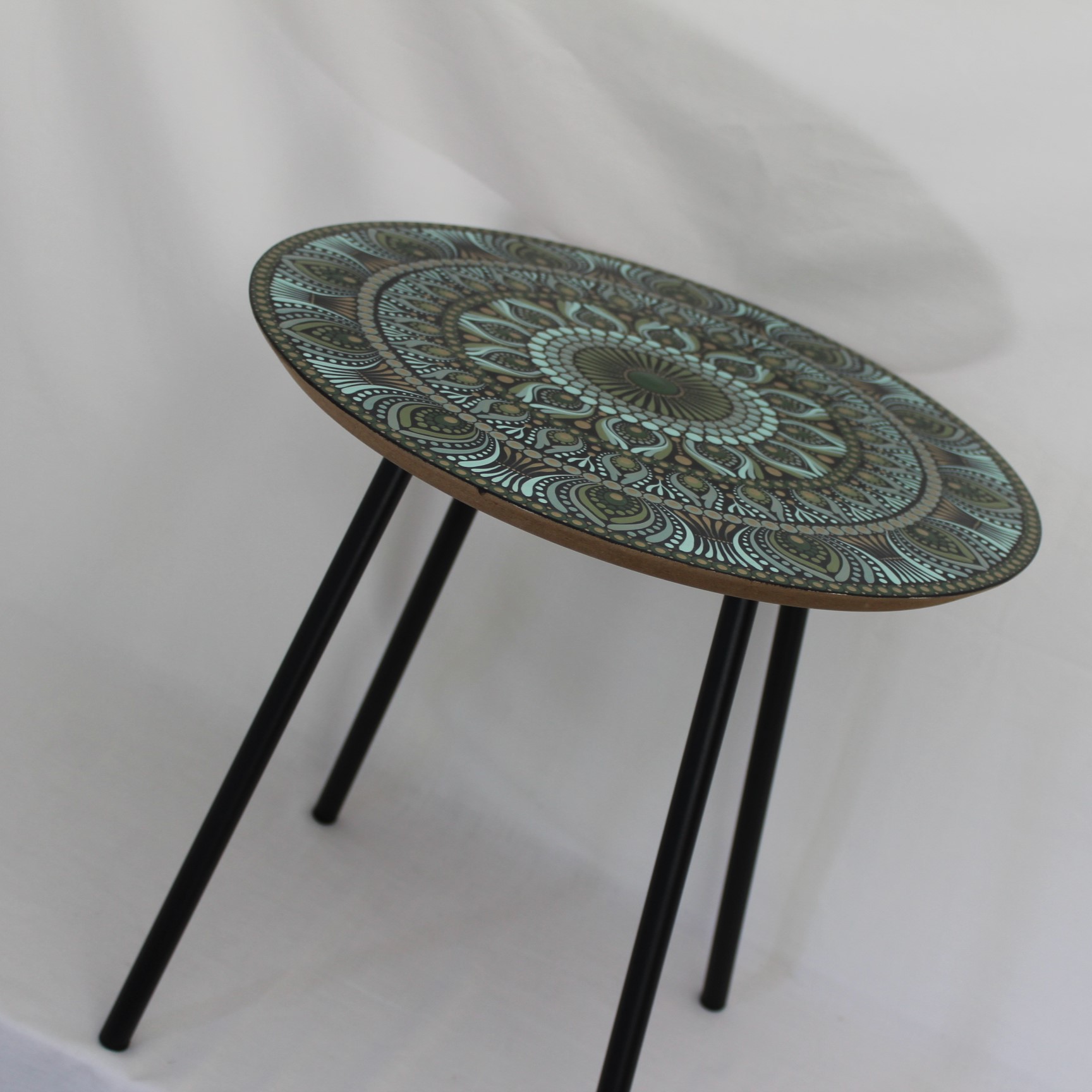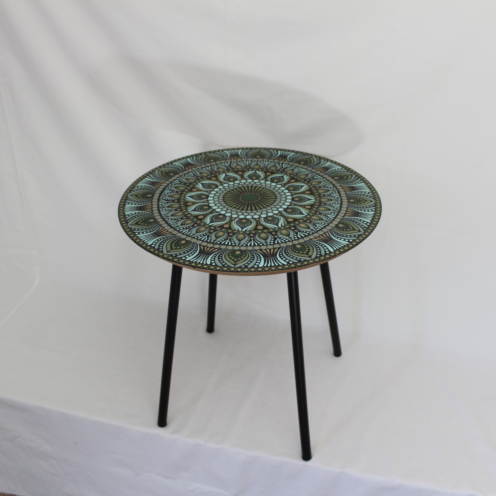Ein handgemalter Mandala Beistelltisch, der modernes Design mit künstlerischer Handarbeit vereint. Der runde Tisch Ein handgemalter Mandala Beistelltisch, der modernes Design mit künstlerischer Handarbeit vereint. Der runde Tisch (40 cm hoch, 40 cm Durchmesser) begeistert mit kühlen Türkis-, Oliv- und Goldtönen, die Ruhe und Klarheit ausstrahlen. Das aufwendig gemalte Mandala-Muster wurde mit hochwertigen Acrylfarben und schützendem Lack versiegelt – langlebig, edel und einzigartig. Die schwarzen Metallbeine sorgen für einen modernen Kontrast und machen den Tisch zu einem stilvollen Highlight in jedem Raum.
