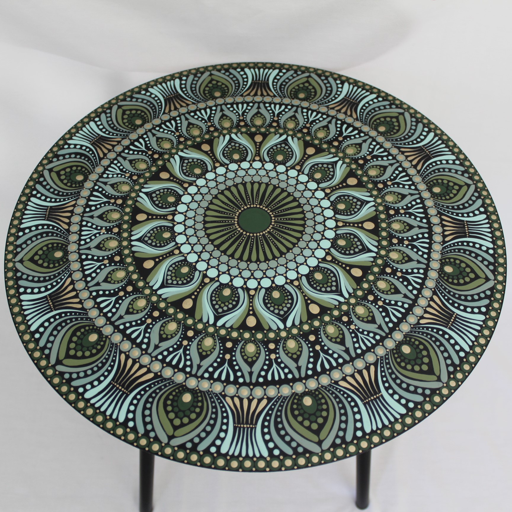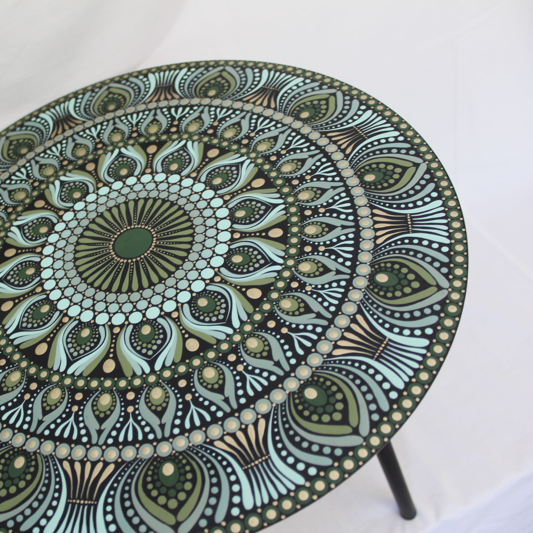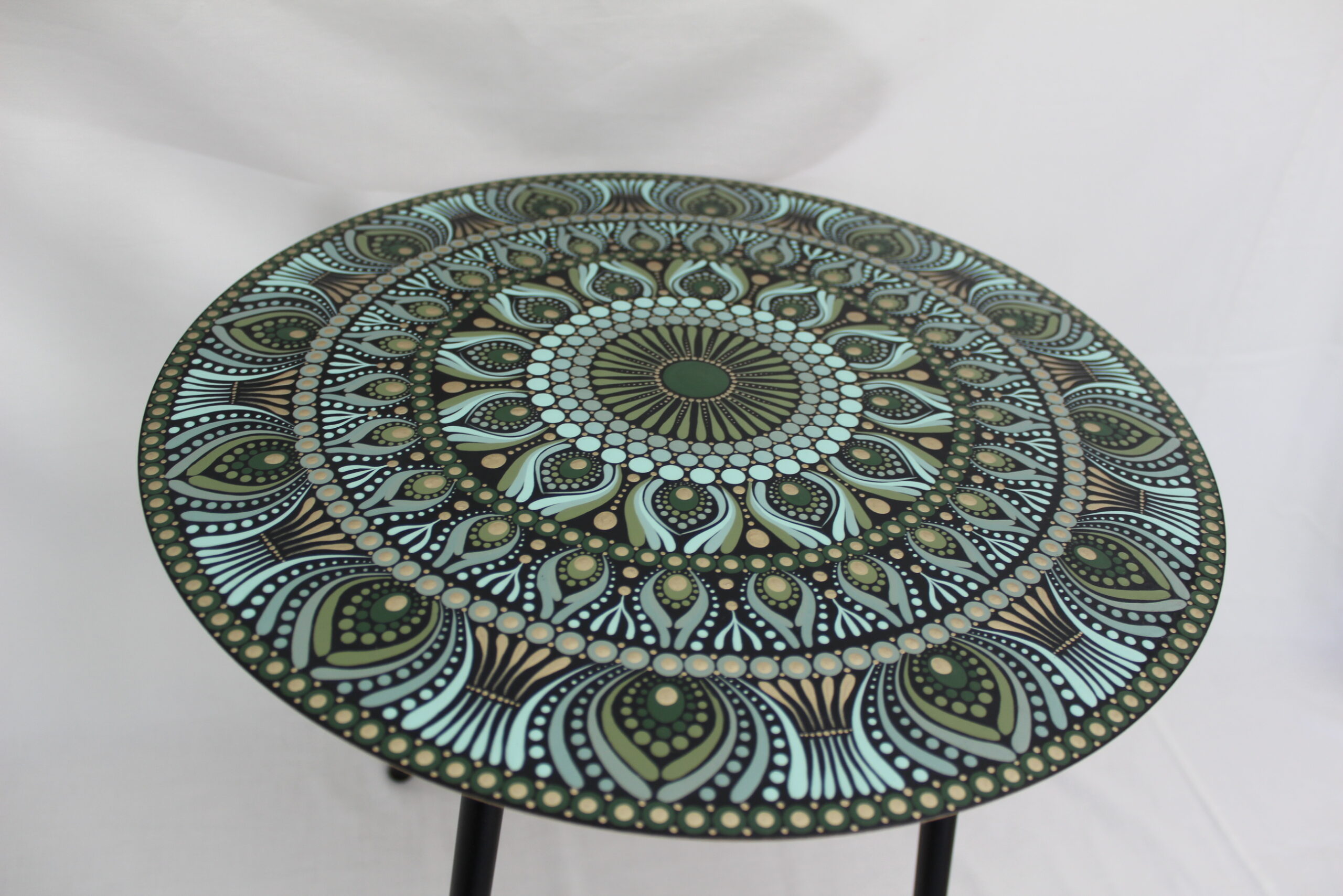 Das kunstvolle Mandala-Muster in Türkis, Olivgrün, Gold und Schwarz verleiht dem Tisch eine kühle, moderne Ausstrahlung, die perfekt zu minimalistischen oder skandinavischen Wohnstilen passt. Die feinen Punkte und Linien entstehen in präziser Handarbeit, was jedem Tisch eine eigene, unverwechselbare Persönlichkeit gibt.