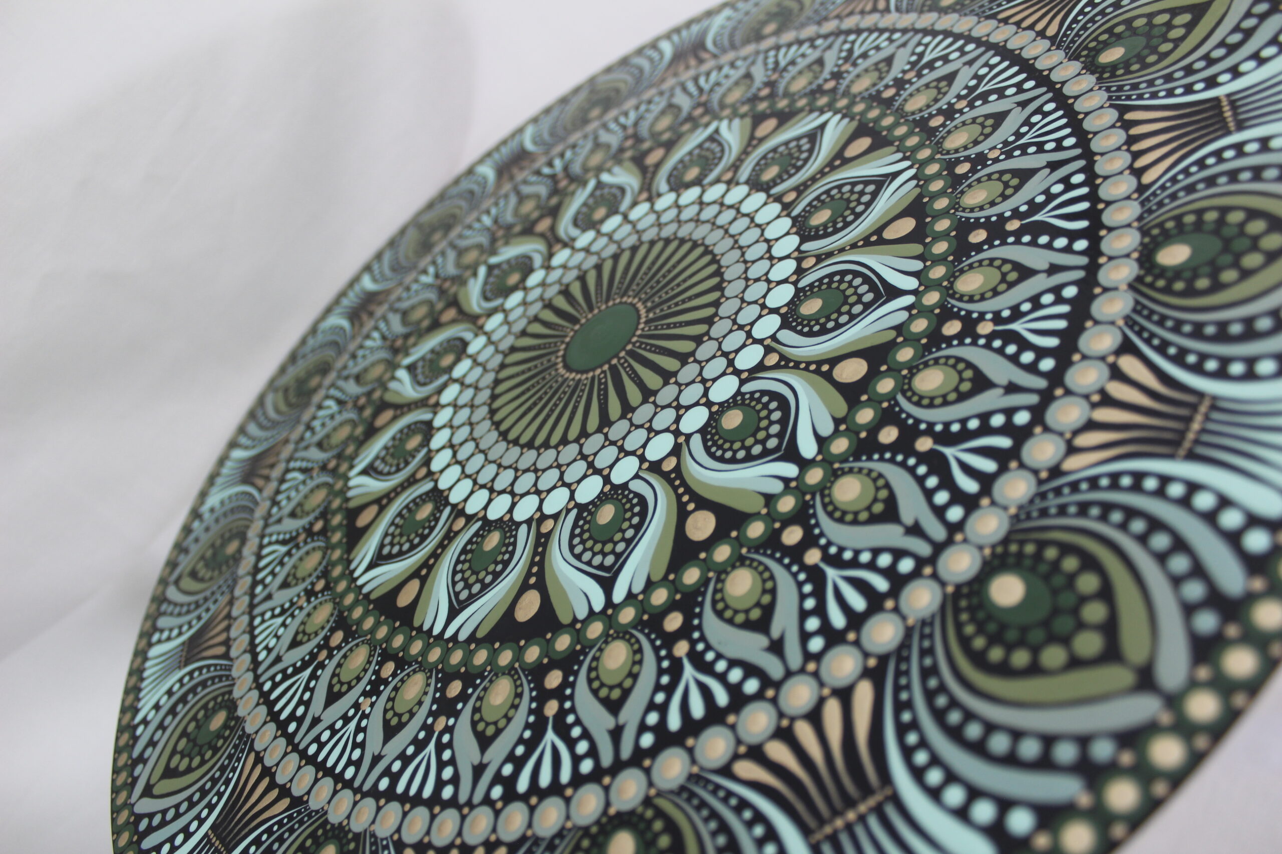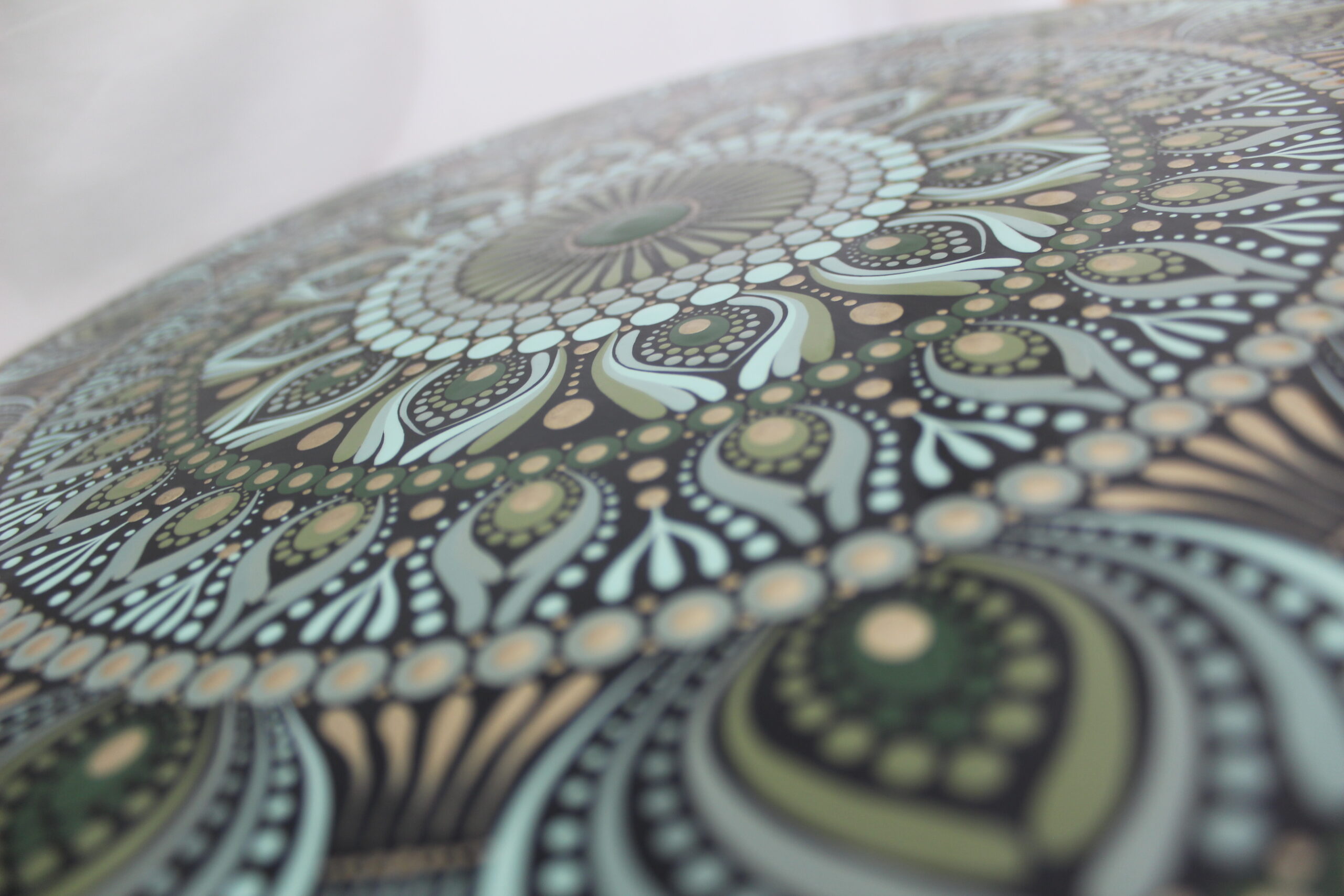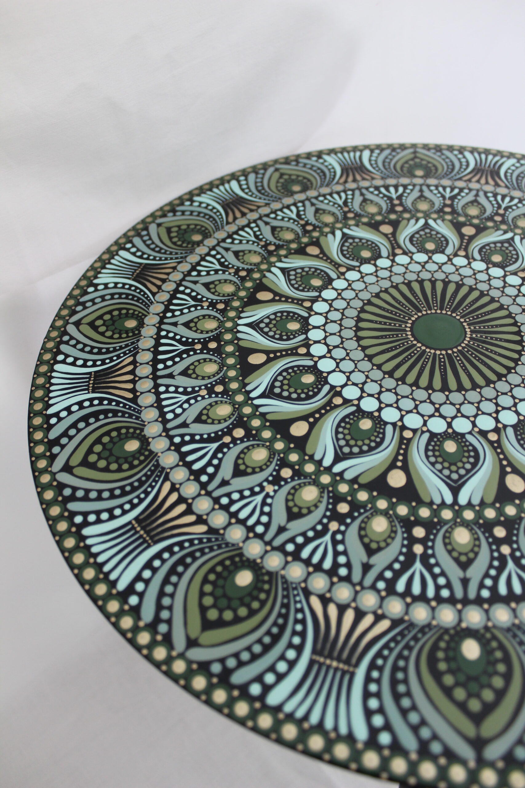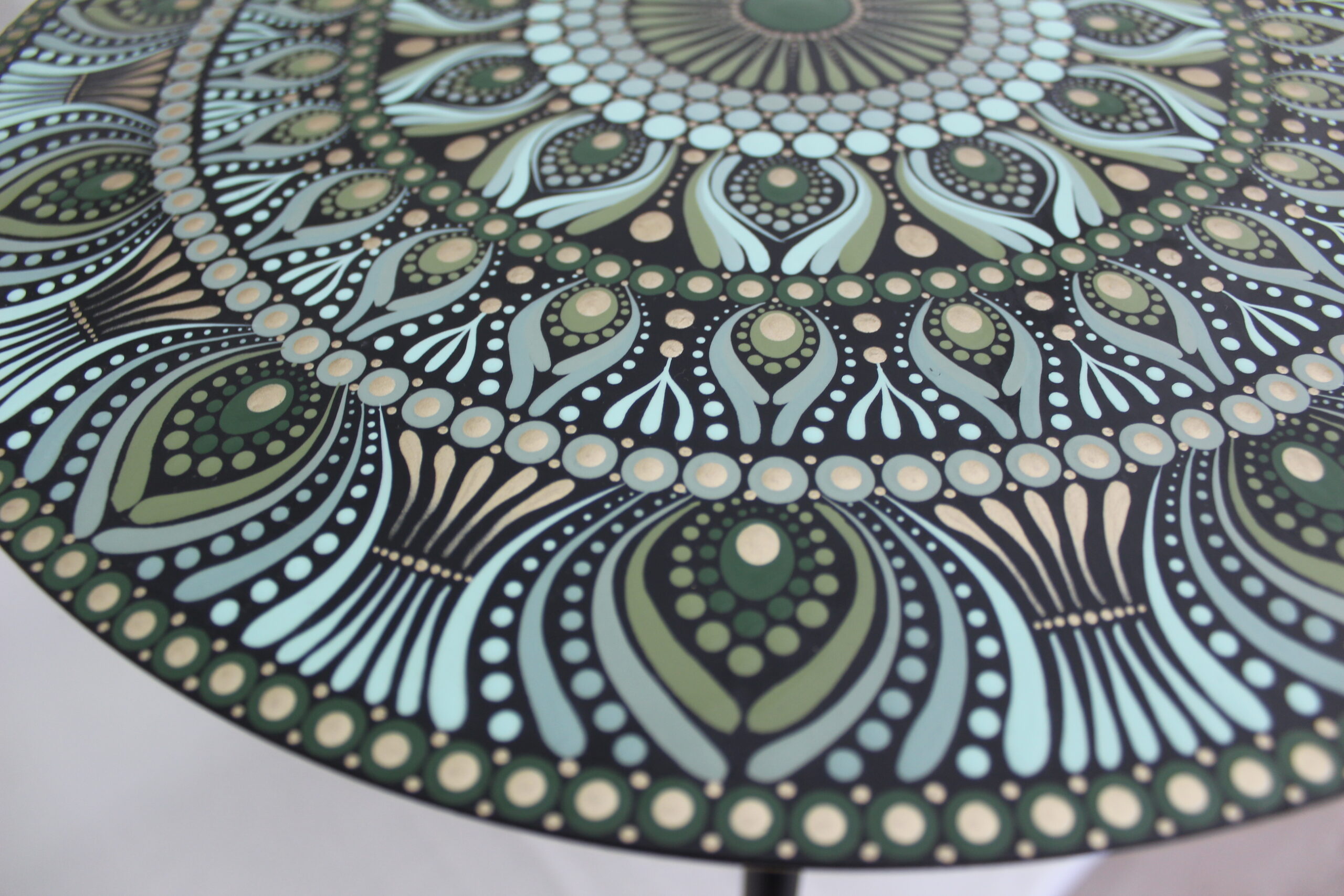 Das kunstvolle Mandala-Muster in Türkis, Olivgrün, Gold und Schwarz verleiht dem Tisch eine kühle, moderne Ausstrahlung, die perfekt zu minimalistischen oder skandinavischen Wohnstilen passt. Die feinen Punkte und Linien entstehen in präziser Handarbeit, was jedem Tisch eine eigene, unverwechselbare Persönlichkeit gibt.