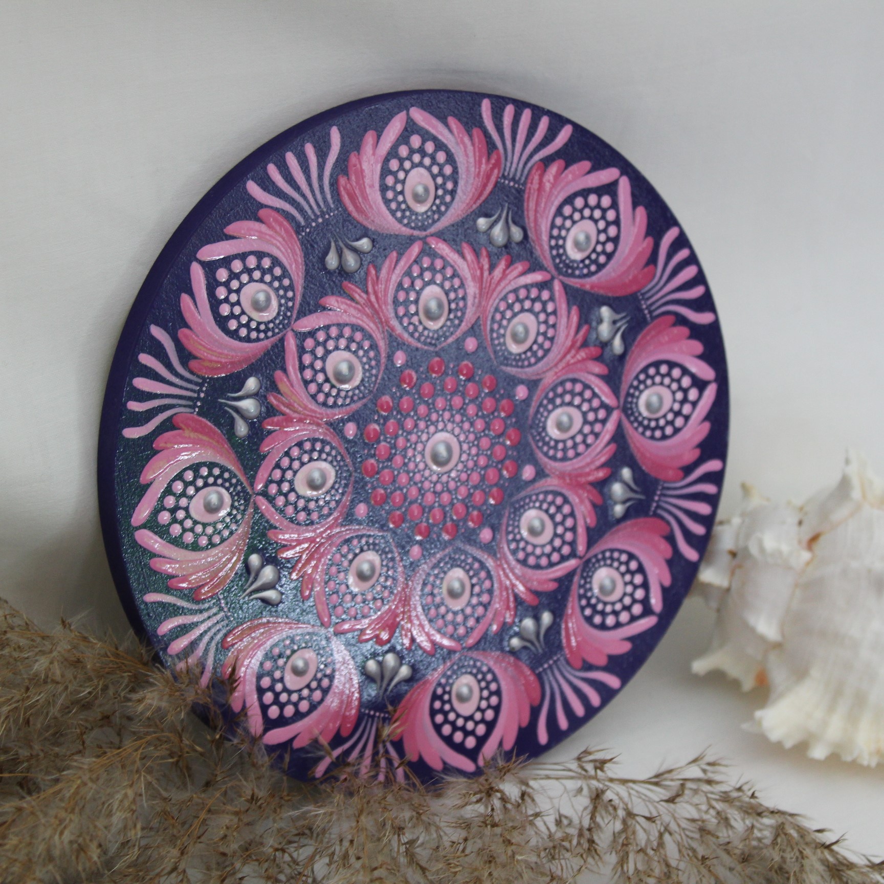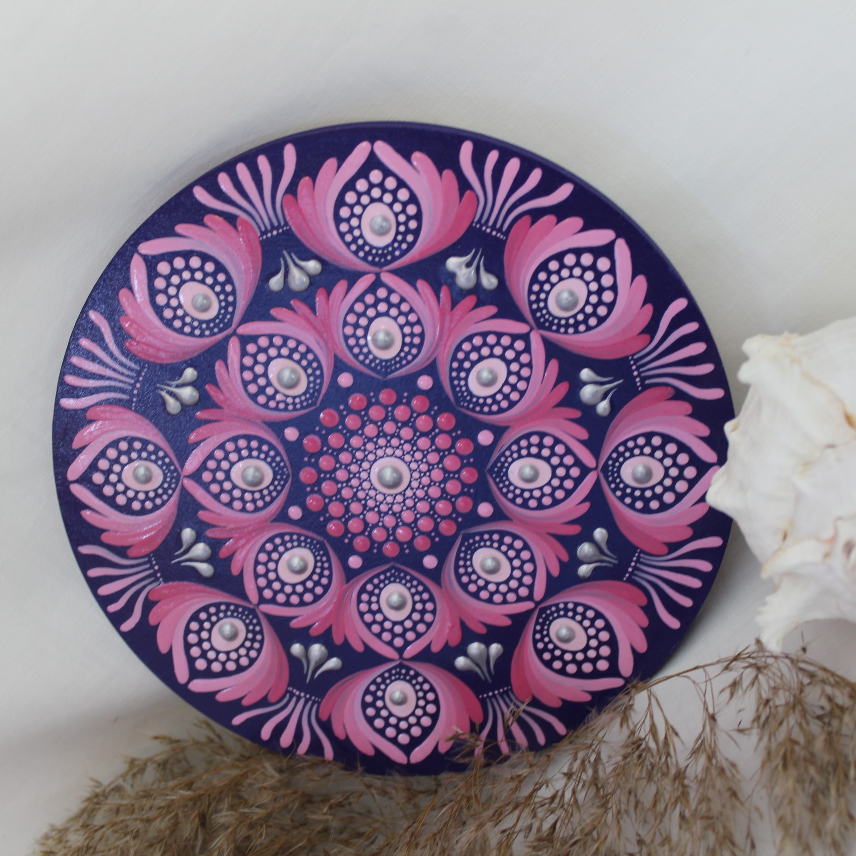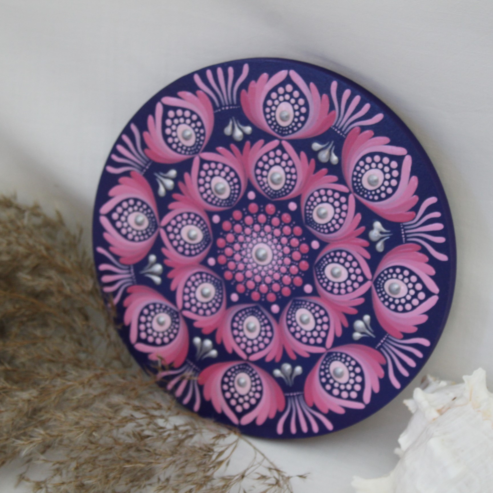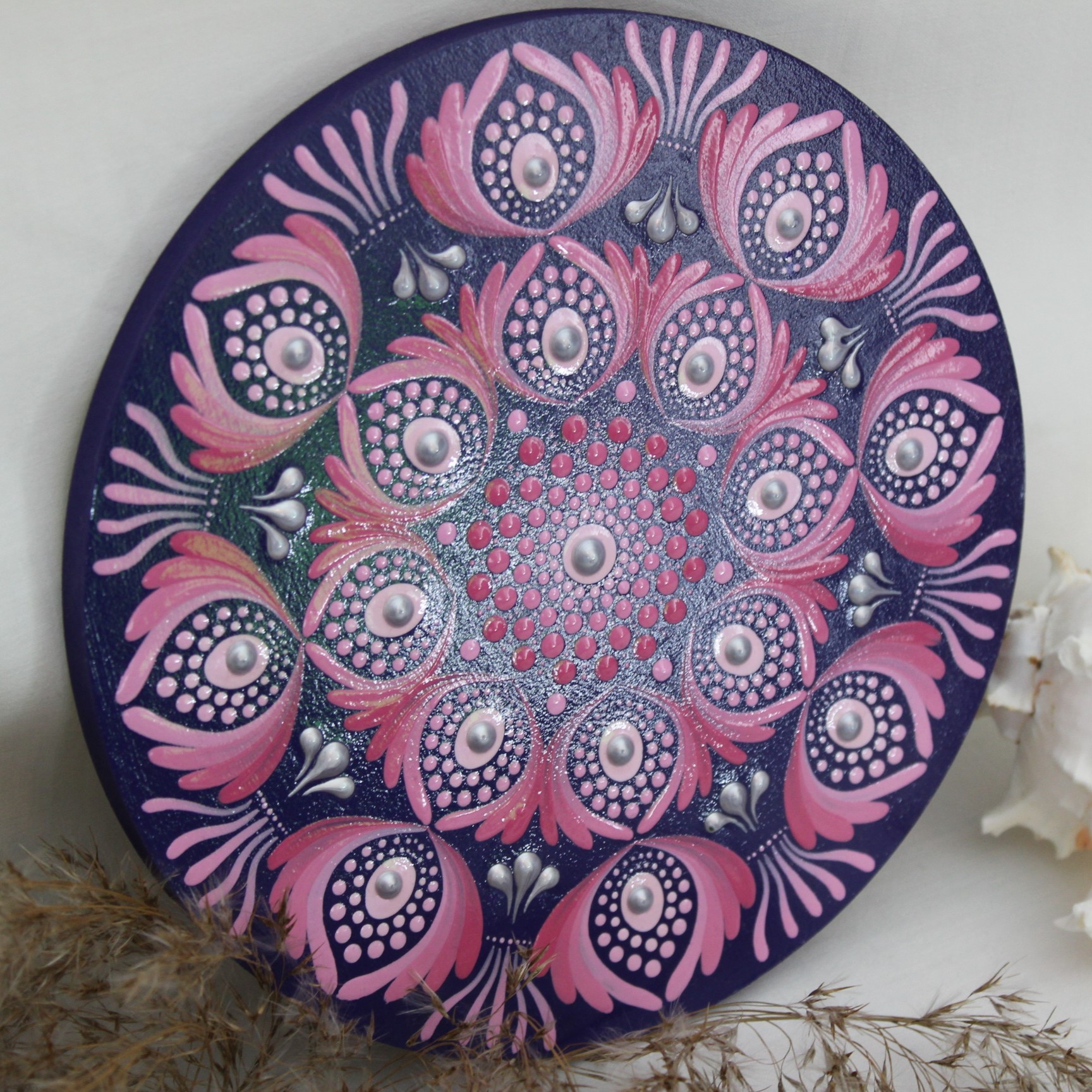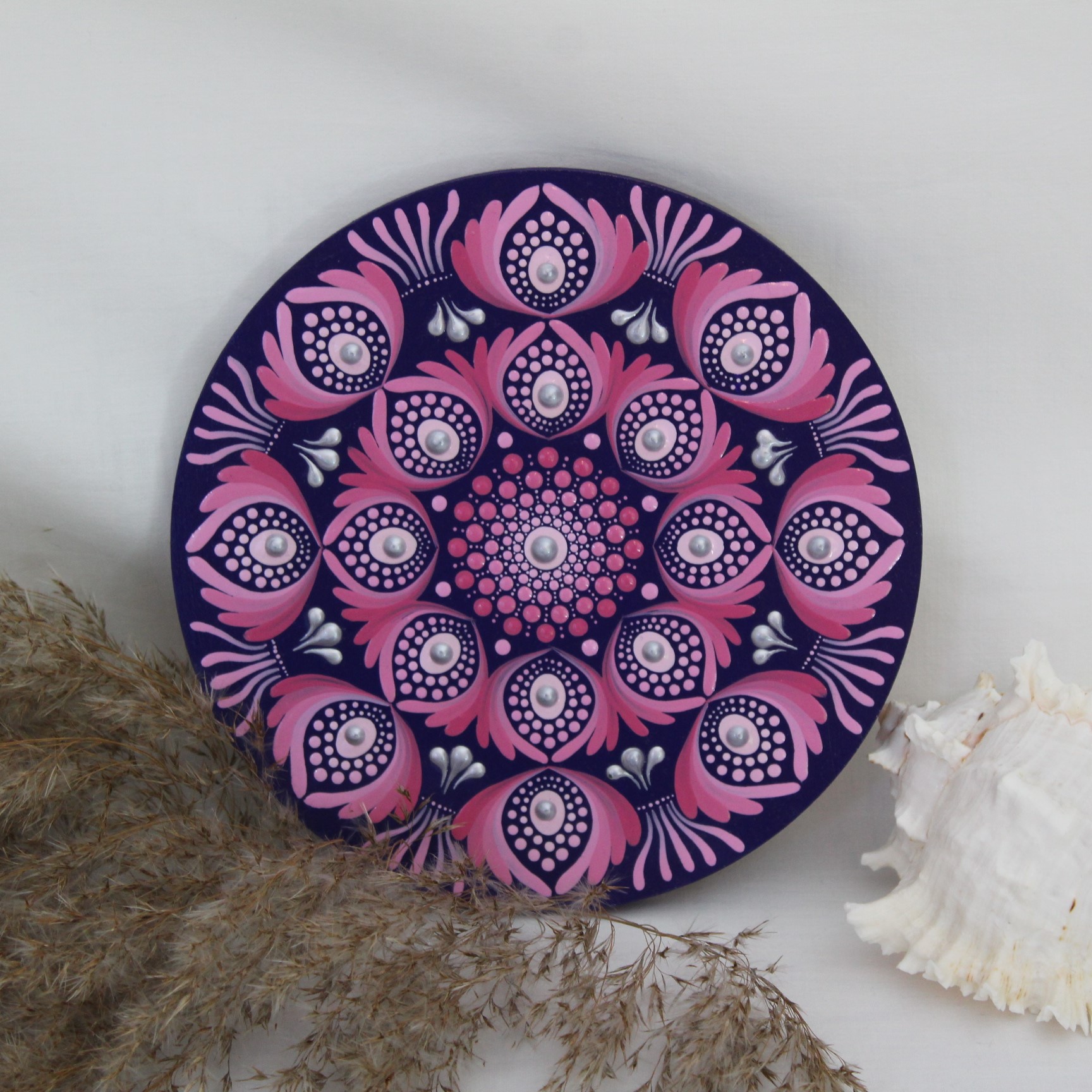 Das Muster erinnert an stilisierte Blüten, die sich kreisförmig um das Zentrum herum entfalten. Die kräftigen Pink- und Rosatöne in Kombination mit tiefem Violett schaffen ein intensives Farbspiel, das sofort ins Auge fällt. Durch die Verwendung spezieller Acrylfarben entsteht ein sanfter 3D-Effekt, der dem Mandala Tiefe und Ausstrahlung verleiht.