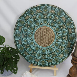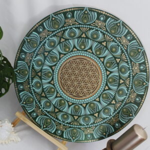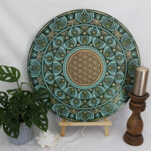 Dieses Mandalabild beeindruckt durch seine sorgfältig gestalteten Mandalamotive und die harmonische Farbgebung in Grün und Türkis, die Ruhe und Ausgeglichenheit ausstrahlen.